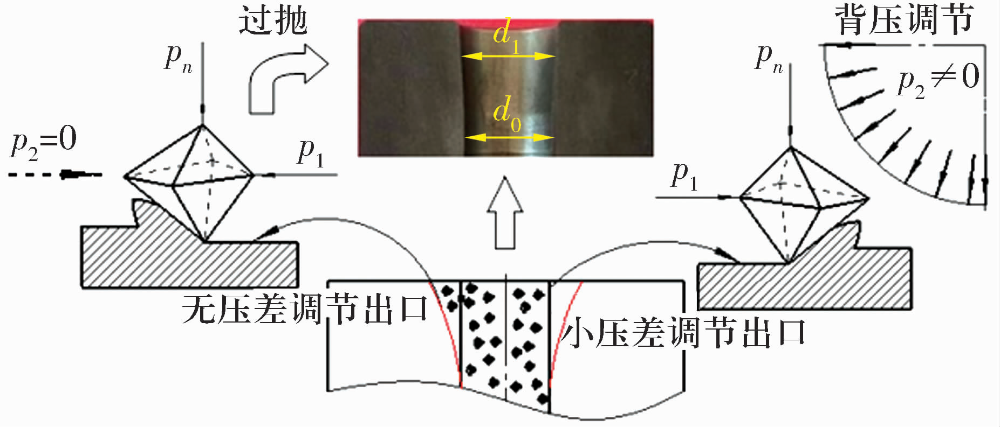 在上述無背壓的“穿膛過”磨粒流加工條件下,將加工后的工件線切割開,可以明顯看出進(jìn)出口處的尺寸d1,大于中間區(qū)域的尺寸d0,并形成“喇叭口”。出現(xiàn)該結(jié)果的主要原因是由于黏彈性磨料在出口處的突然擠入與釋放時(shí)形成的擠壓壓力過大,從而在工件兩端出現(xiàn)嚴(yán)重的過拋現(xiàn)象,嚴(yán)重影響空心滾子的尺寸。為避免“喇叭口”的形成,應(yīng)該控制進(jìn)出口的壓差,使磨粒流在加工過程中實(shí)現(xiàn)均勻的擠壓運(yùn)動(dòng)。因此,在擠壓過程中對磨粒流施加一個(gè)回程壓力,即背壓P2與“穿膛過”式(背壓P2為零)的情況相比,在擠壓過程中增加磨料流回程壓力,可以降低壓力在進(jìn)出口處的突變,實(shí)現(xiàn)進(jìn)出口處壓力的小壓差調(diào)節(jié),從而有效抑制“喇叭口”的形成,其原理如圖6所示。